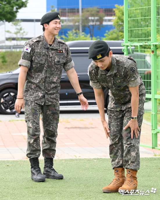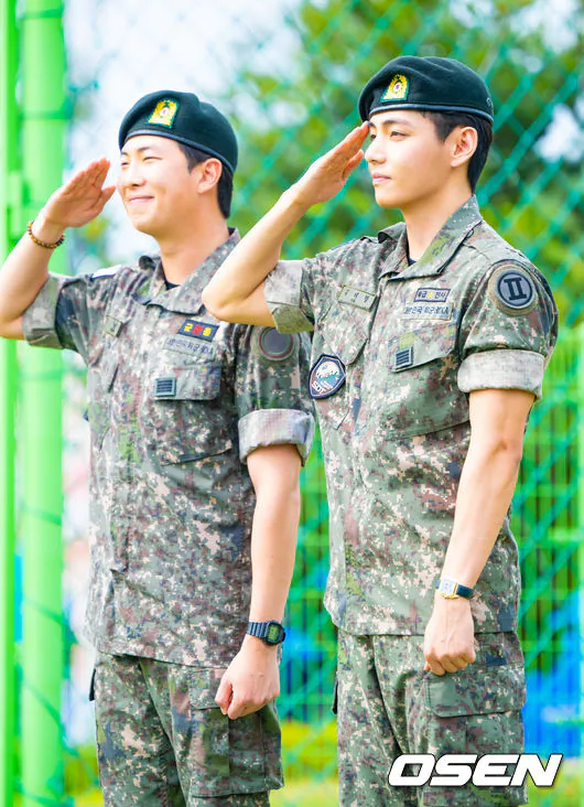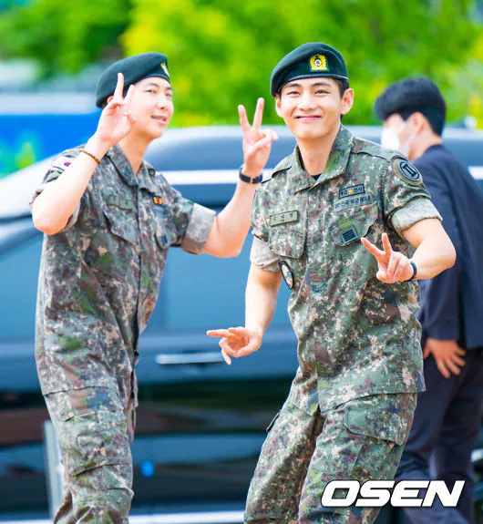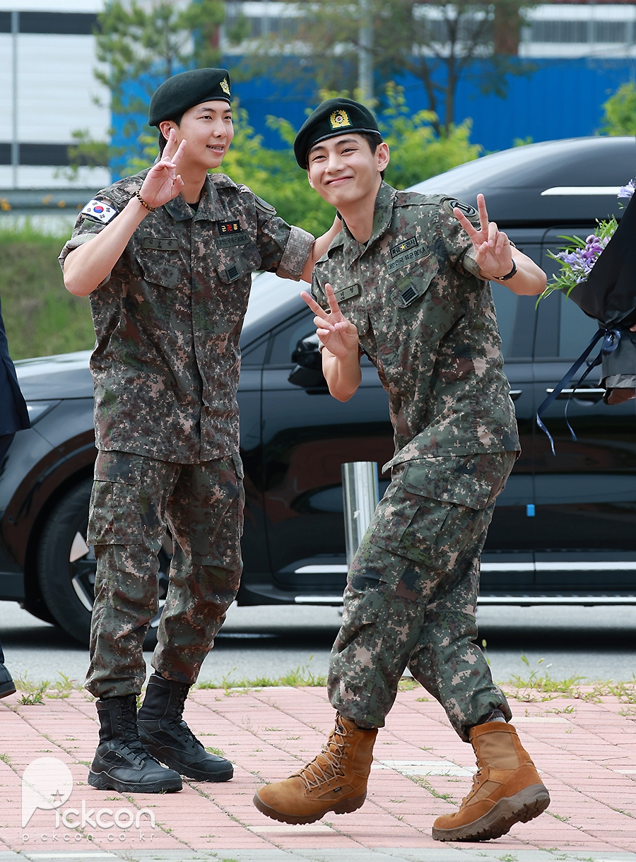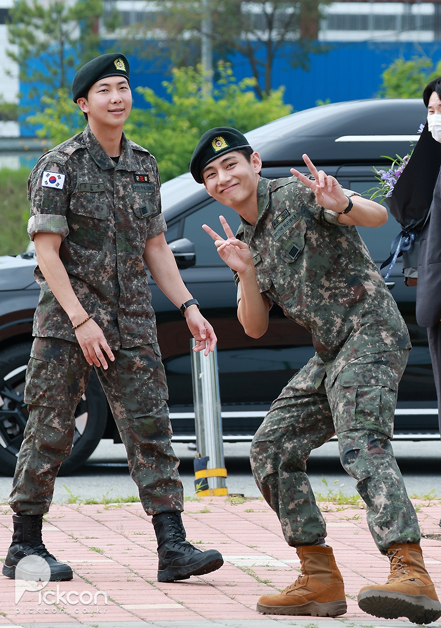 (엑스포츠뉴스 춘천, 고아라 기자) 10일 오전 그룹 방탄소년단(BTS) RM, 뷔가 육군 현역으로 군 복무를 마치고 만기 전역했다.방탄소년단 RM, 뷔가 포즈를 취하고 있다.RM과 뷔는 지난 2023년 12월 나란