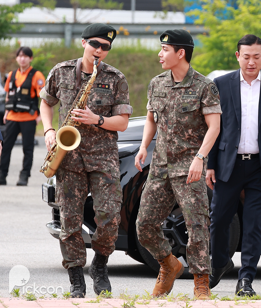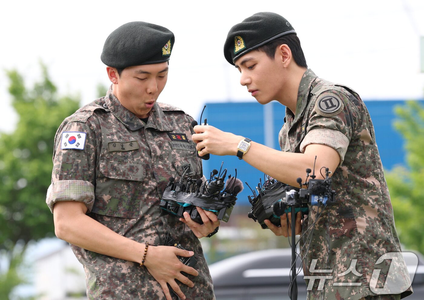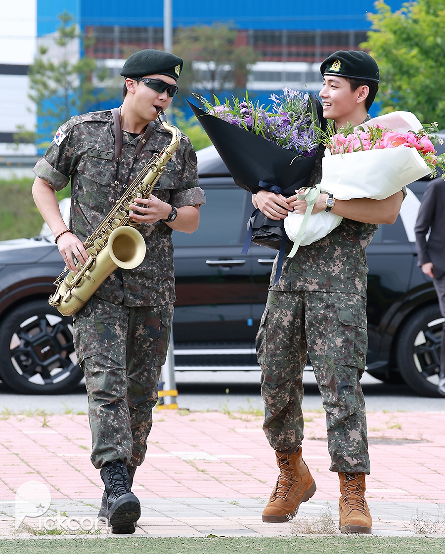 (엑스포츠뉴스 춘천, 고아라 기자) 10일 오전 그룹 방탄소년단(BTS) RM, 뷔가 육군 현역으로 군 복무를 마치고 만기 전역했다.방탄소년단 RM, 뷔가 포즈를 취하고 있다.RM과 뷔는 지난 2023년 12월 나란